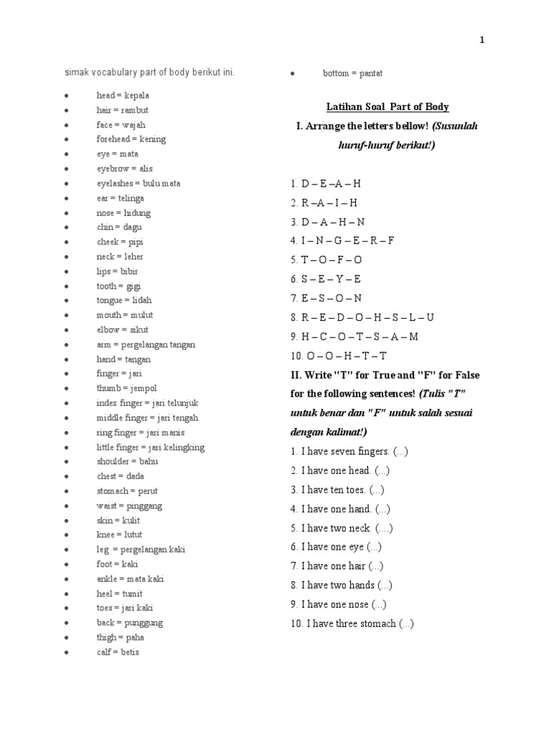 Soal Tentang Part Of Body : Latihan Soal Part Of Body Pdf : Bulu tangkis badminton adalah suatu olahraga raket yang dimainkan oleh dua orang (untuk tunggal) atau dua pasangan (untuk ganda) yang saling berlawanan.. However, there is no universally standard definition of what constitutes an organ, and some tissue groups' status as one is debated. Type of speaking speaking is the delivery of language through the mouth. I have two ears b. To speak, we create sounds using many parts of our body, inclu. Dapatkan penjelasan bukan hanya jawaban.