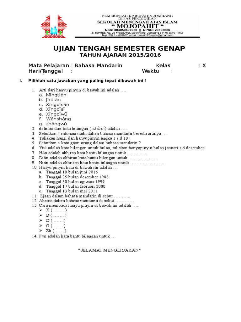 Soal dan jawaban bahasa mandarin kelas 12. Yuk disimak contoh soal kelas 1 pas tema 3 dengan kunci jawabannya di bawah ini. Silabus bahasa mandarin sd kelas 1 6 lengkap bank soal ujian. Pada hakekatnya bahasa manusia merupakan suatu…. Buatlah kalimat dari kata kata berbahasa mandarin tersebutpliss.